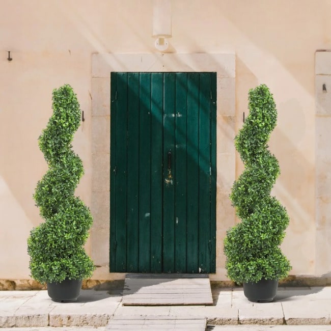 La forme topiaire en tire-bouchon crée un effet visuel saisissant grâce à ses courbes régulières qui s’enroulent harmonieusement de la base au sommet.