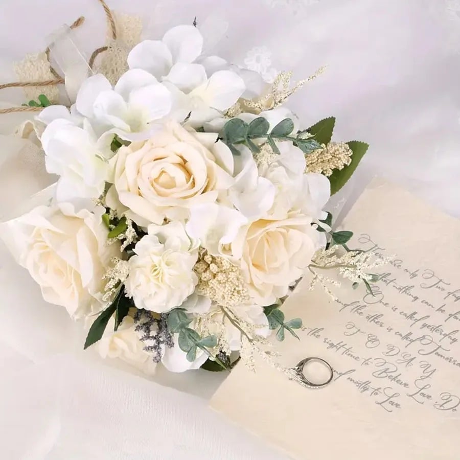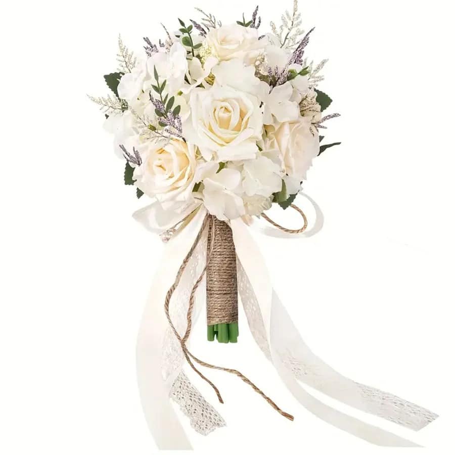 Ce bouquet artificiel mariage présente un assemblage raffiné de roses blanches aux pétales délicatement ourlés, accompagnées de petites fleurs blanches et de feuillage vert tendre.