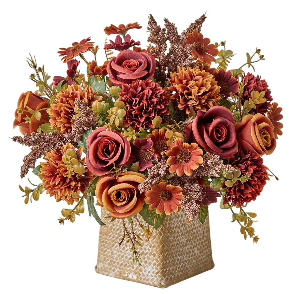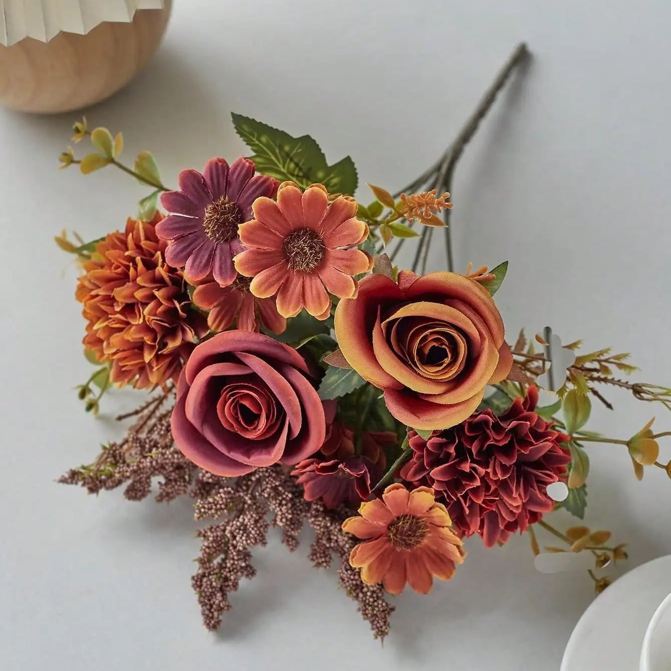 Ce bouquet d’automne artificiel présente un mélange harmonieux de fleurs et feuillages aux teintes chaudes et profondes.
