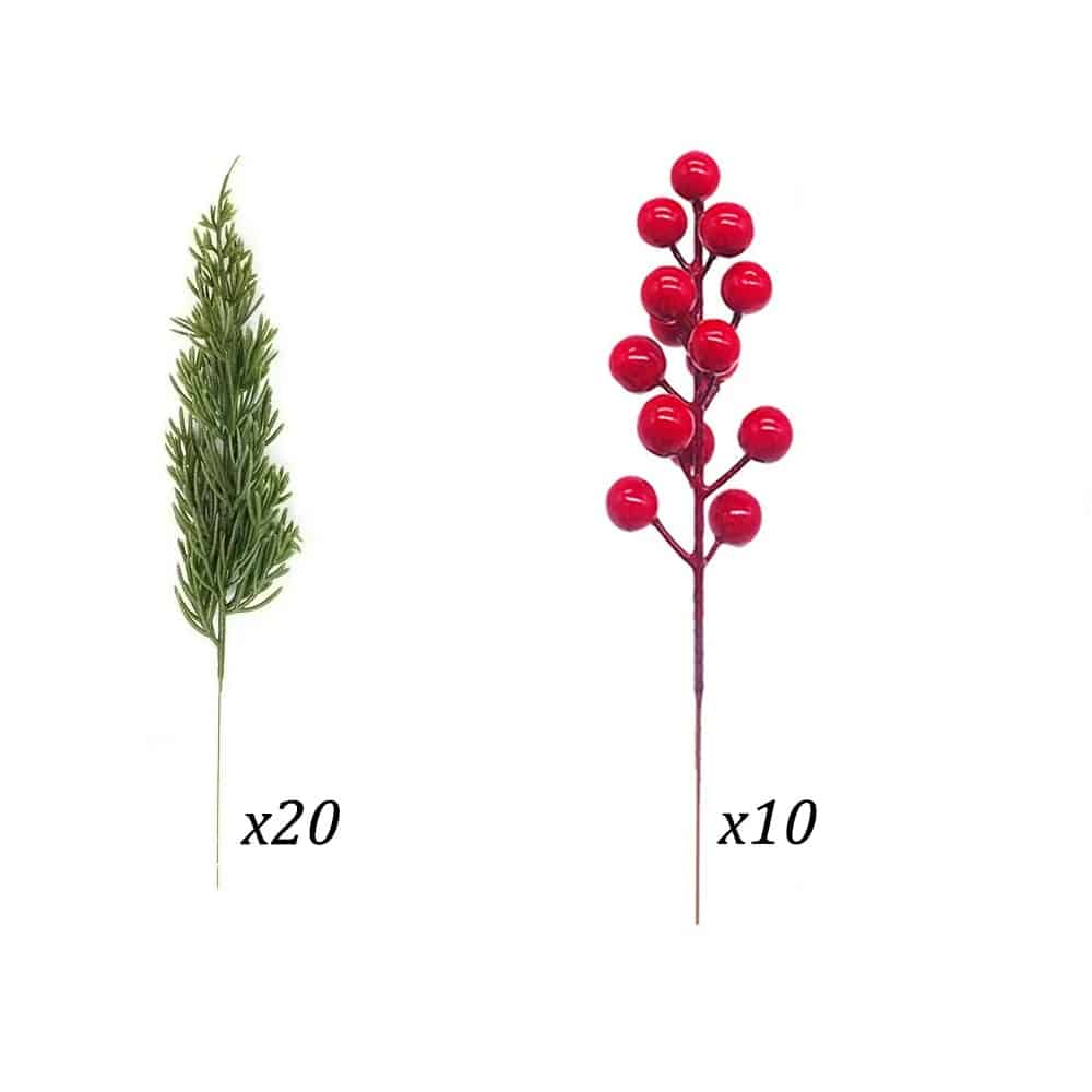 Les 20 branches de sapin forment une base généreuse aux tons verts profonds, reproduisant fidèlement l’aspect des conifères naturels avec leurs aiguilles fines et serrées.