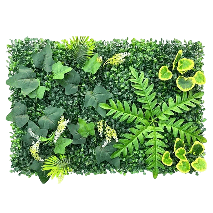 Le panneau rassemble plusieurs types de plantes artificielles : des fougères aux frondes délicatement découpées, des feuilles larges et arrondies rappelant l’eucalyptus, des petites feuilles ovales vert tendre, et des branchages aux feuillages plus sombres.