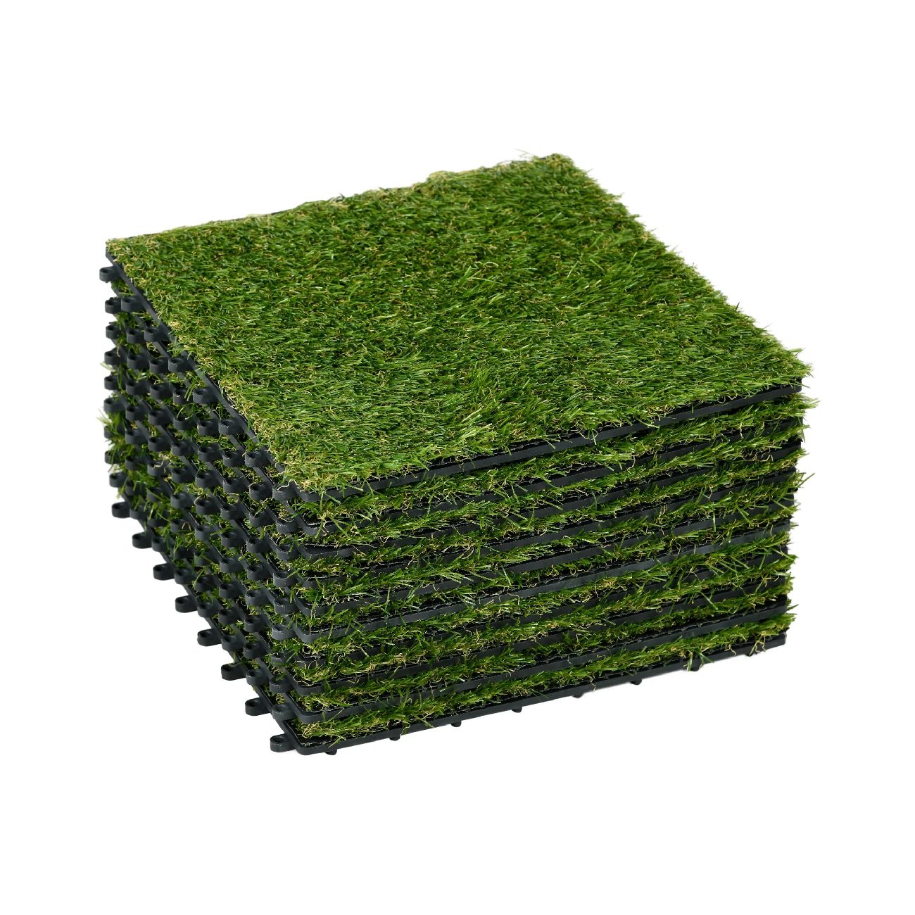 Ces carrés de gazon artificiel présentent une surface dense d’herbe synthétique d’un vert naturel intense, reproduisant fidèlement l’apparence d’une pelouse fraîchement tondue.