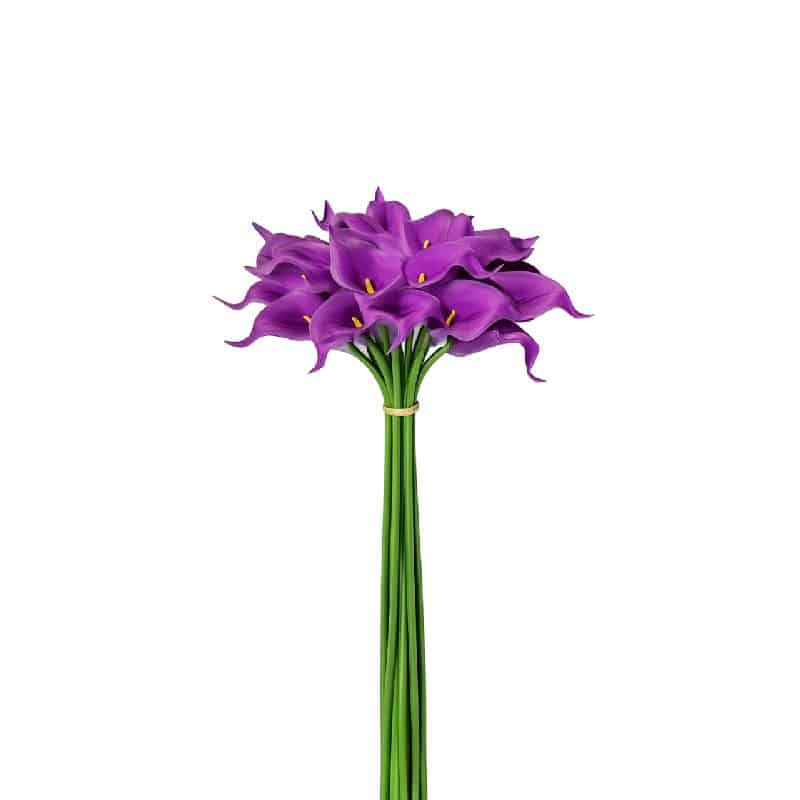 Chaque tige de lys artificiel arbore plusieurs fleurs épanouies d’une teinte violette profonde et uniforme, avec des étamines proéminentes qui reproduisent fidèlement l’aspect naturel de la fleur.