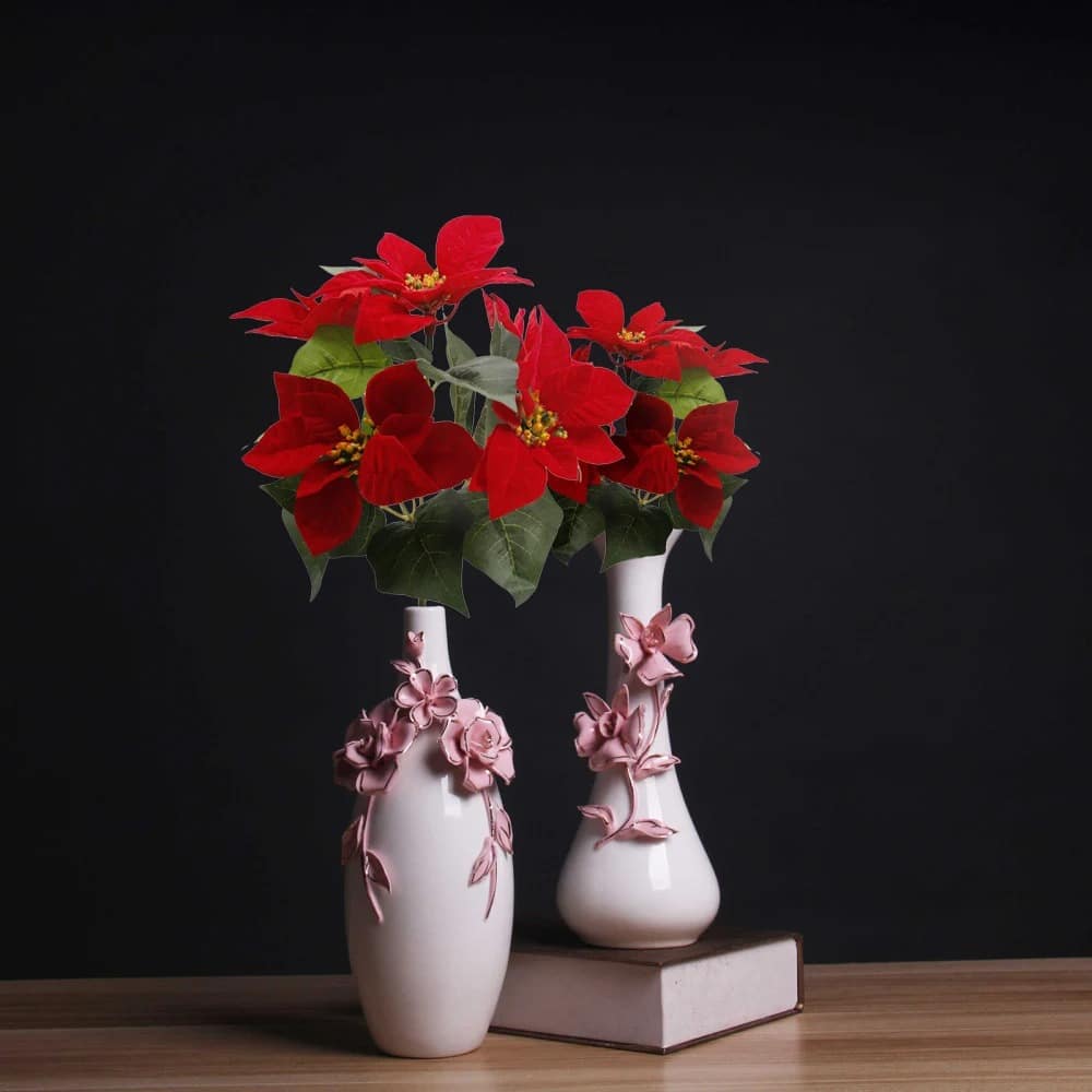 La fausse poinsettia repose sur une tige rigide de couleur naturelle qui facilite son installation dans vos compositions décoratives.