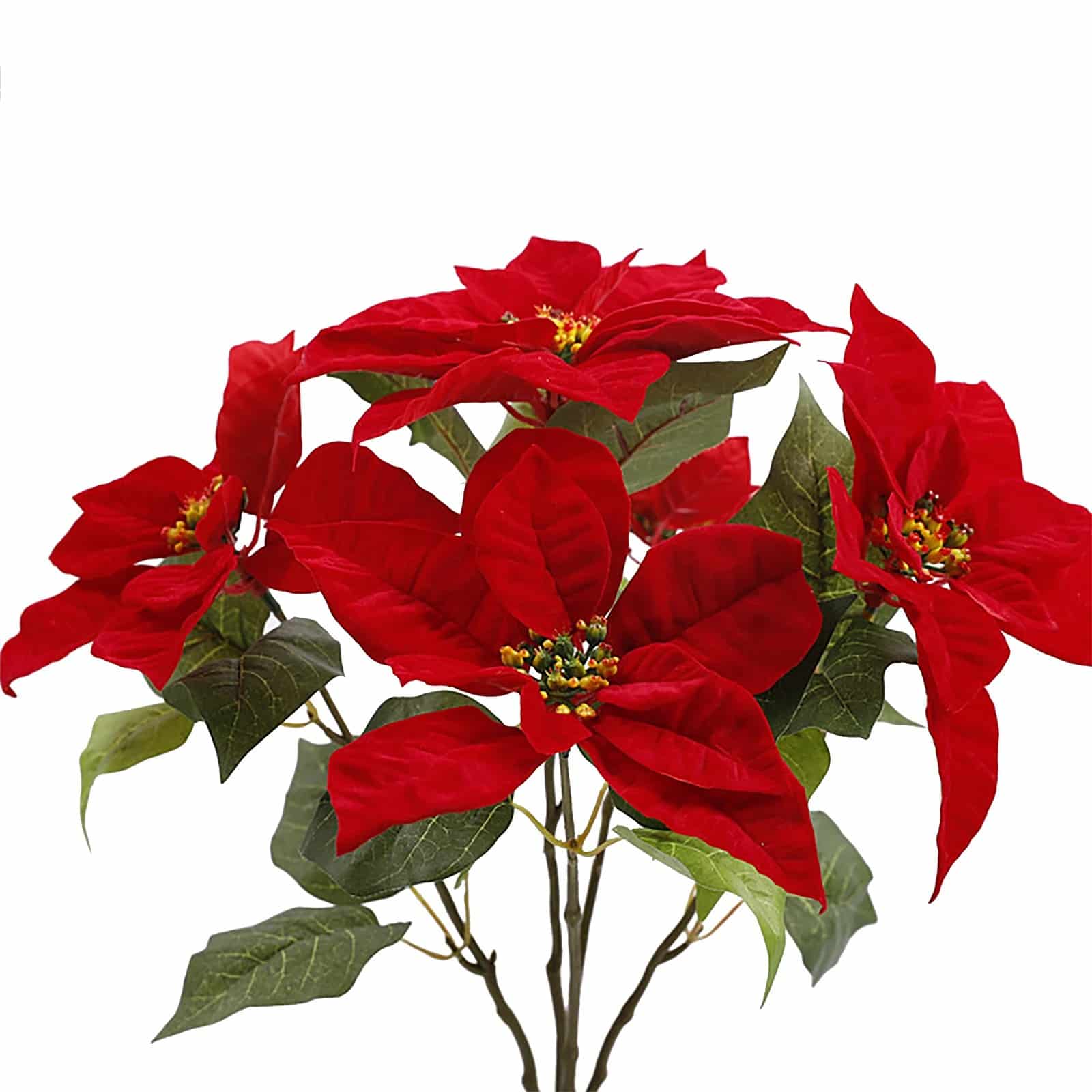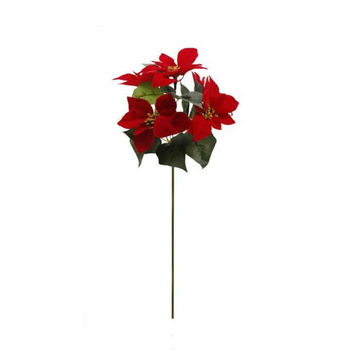 Emblème incontournable de Noël, cette poinsettia artificielle déploie sept bractées rouge éclatant autour d’un cœur jaune-vert, évoquant renaissance et atmosphère festive chaleureuse.