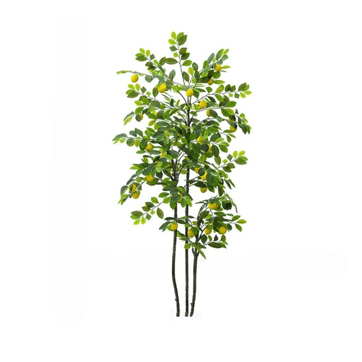 Ce faux citronnier présente trois troncs élancés aux branches délicatement ramifiées, ornées d’un feuillage dense et naturel.