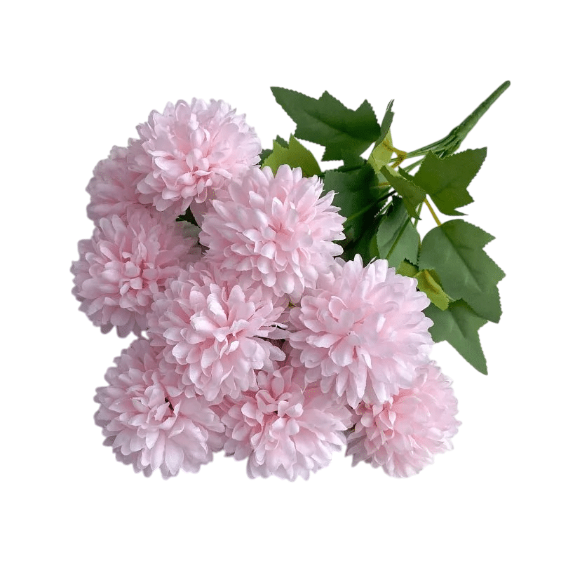 Symbole de joie et d’optimisme, cette tige de chrysanthèmes artificiels dévoile dix pompons roses poudrés aux pétales densément superposés, évoquant la douceur printanière et la romance.