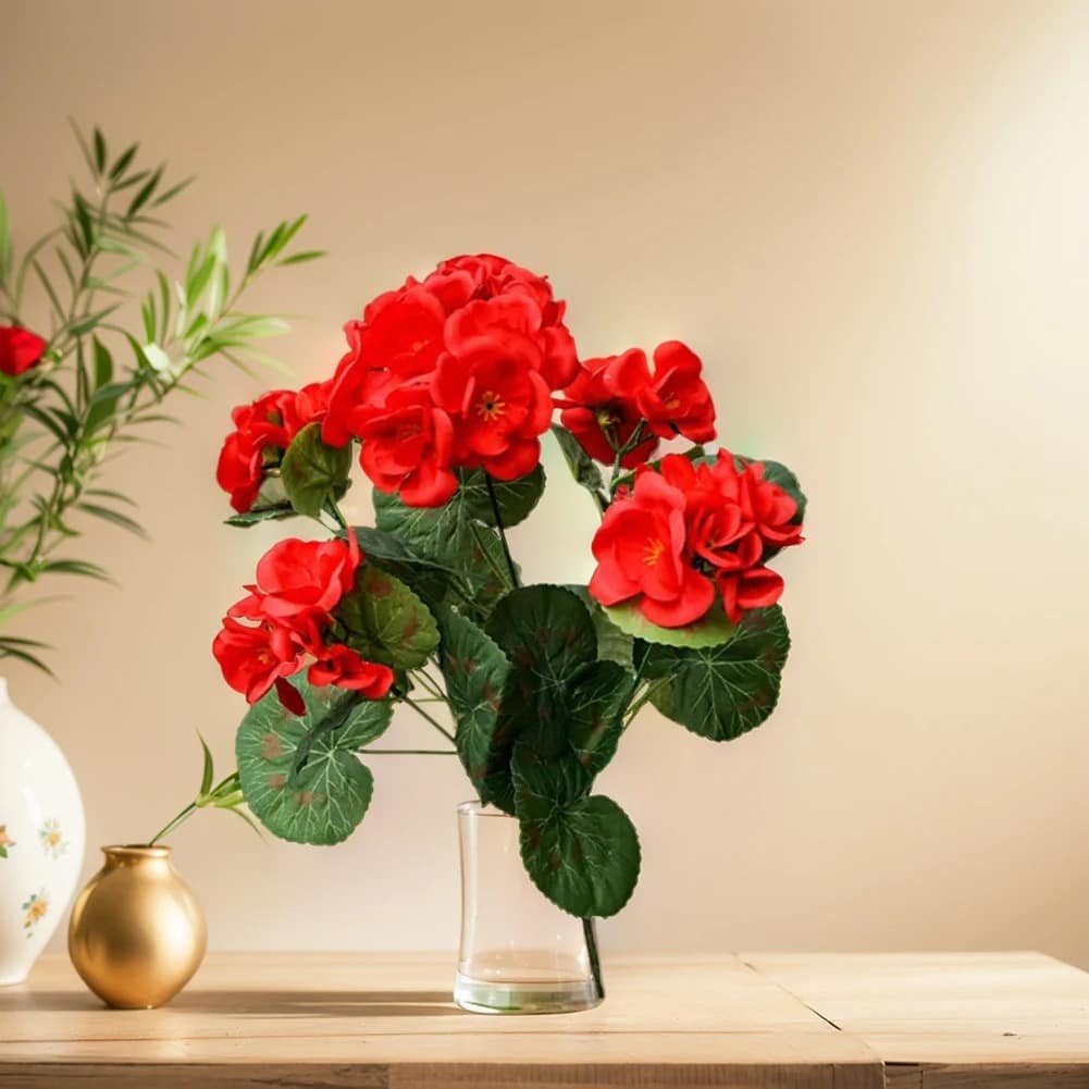 Chaque tige porte une grappe généreuse de petites fleurs d’un rouge éclatant, reproduisant fidèlement l’aspect velouté caractéristique des vrais géraniums.