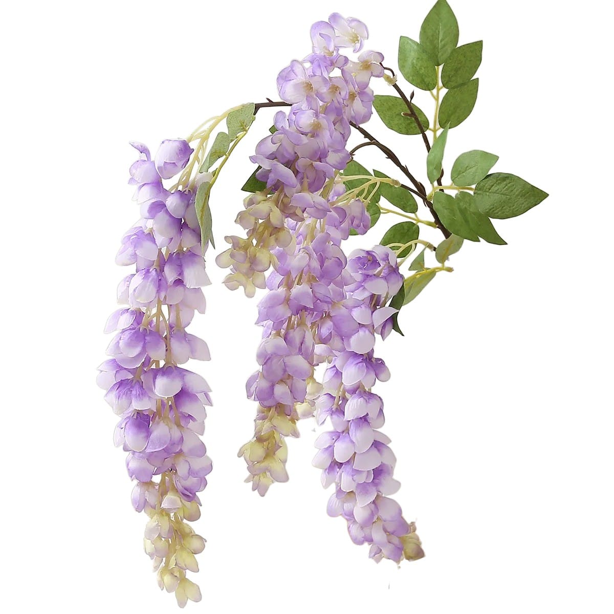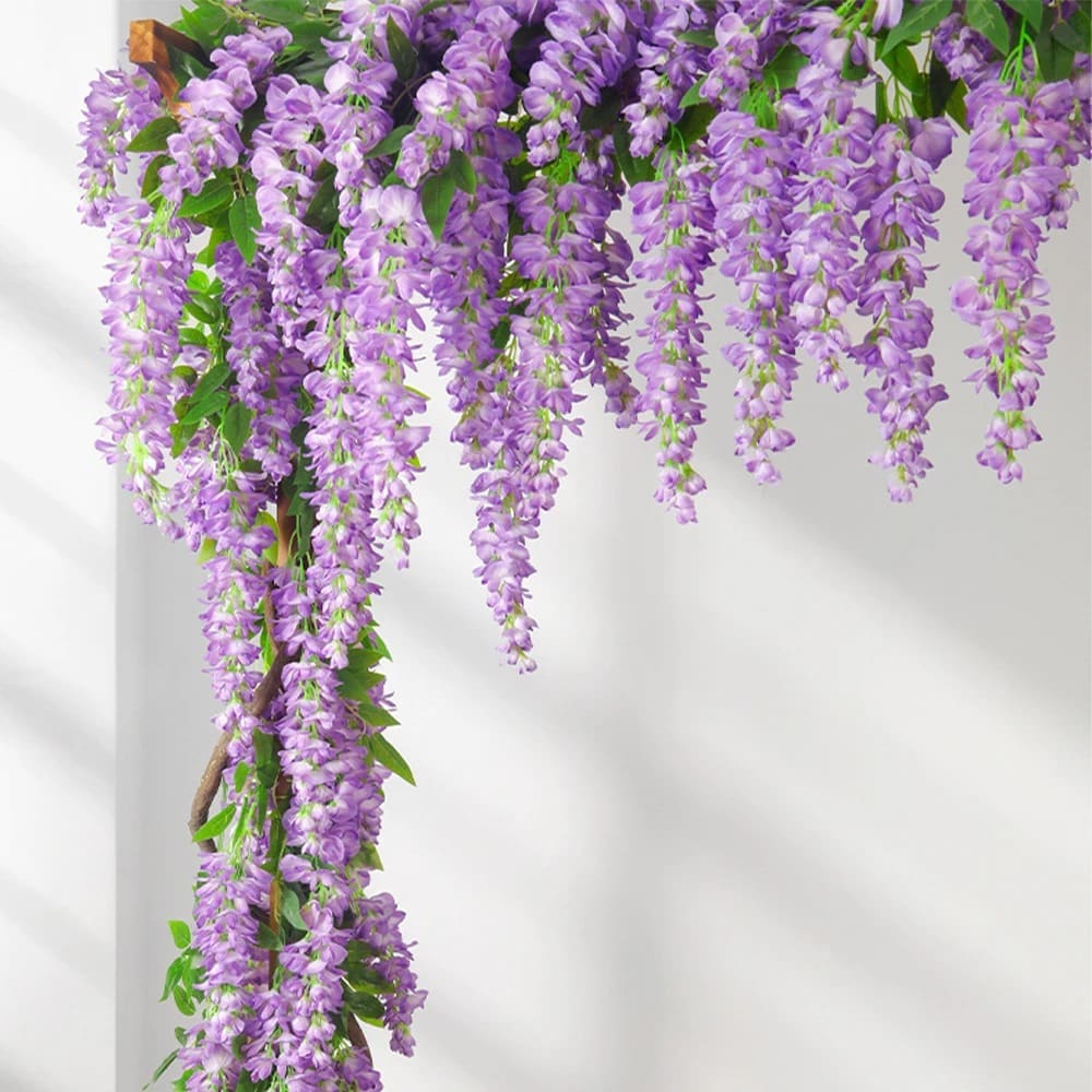 La glycine artificielle extérieur présente une tige élégante ornée de cinq grappes de fleurs retombantes dans des tons violets et blancs délicats.