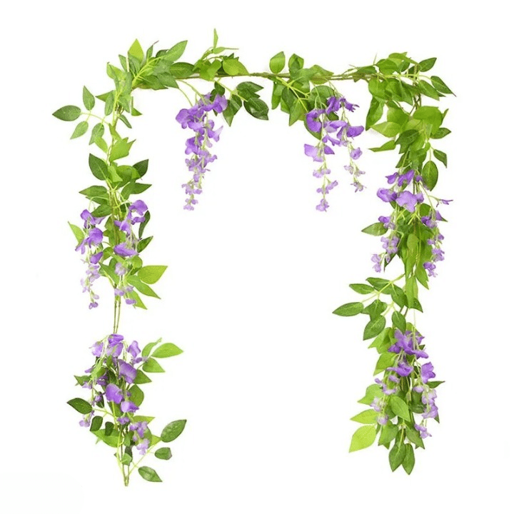 Cette guirlande de glycine artificielle présente de magnifiques grappes de fleurs violettes qui retombent naturellement le long de tiges souples garnies de feuillage vert.