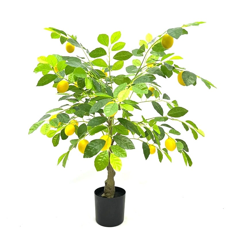 Ce petit citronnier artificiel reproduit fidèlement l’apparence d’un jeune agrume avec ses feuilles vertes brillantes et ses fruits jaunes éclatants.