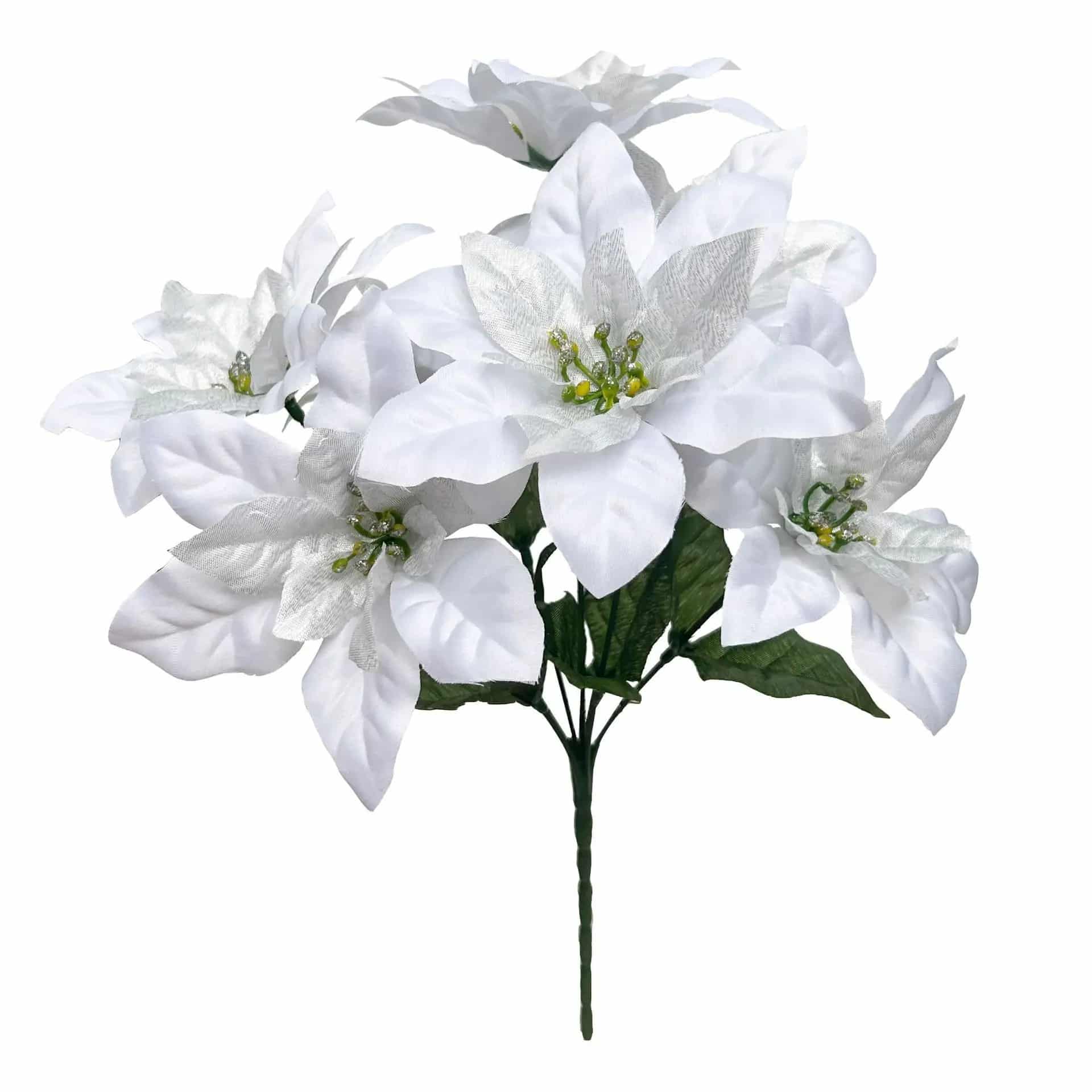 Chaque fleur du poinsettia blanc artificiel mesure environ 8 à 10 centimètres de diamètre et révèle un cœur vert tendre parsemé de petites étamines dorées.