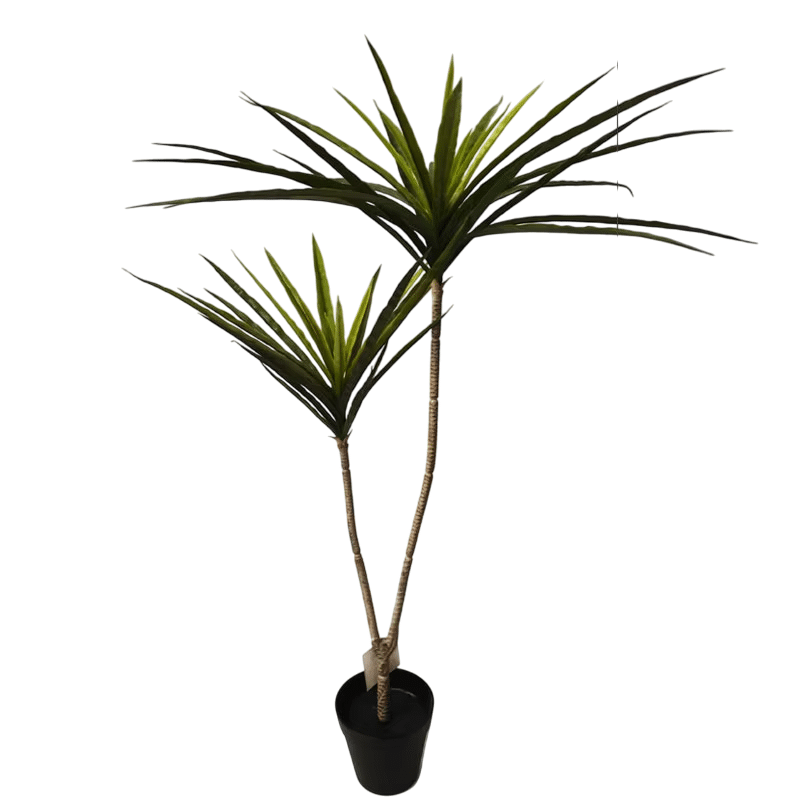 Le Yucca artificiel présente deux branches élancées surmontées de rosettes de feuilles longues et effilées d’un vert intense.